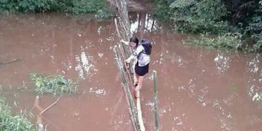 Pengorbanan Seorang Guru Lalui Jembatan Bambu Demi Mengajar